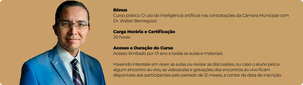 Este curso é destinado especialmente a servidores de Câmara Municipal envolvidos direta ou indiretamente com processos de licitação e contratos do Poder Legislativo, dentre os quais: